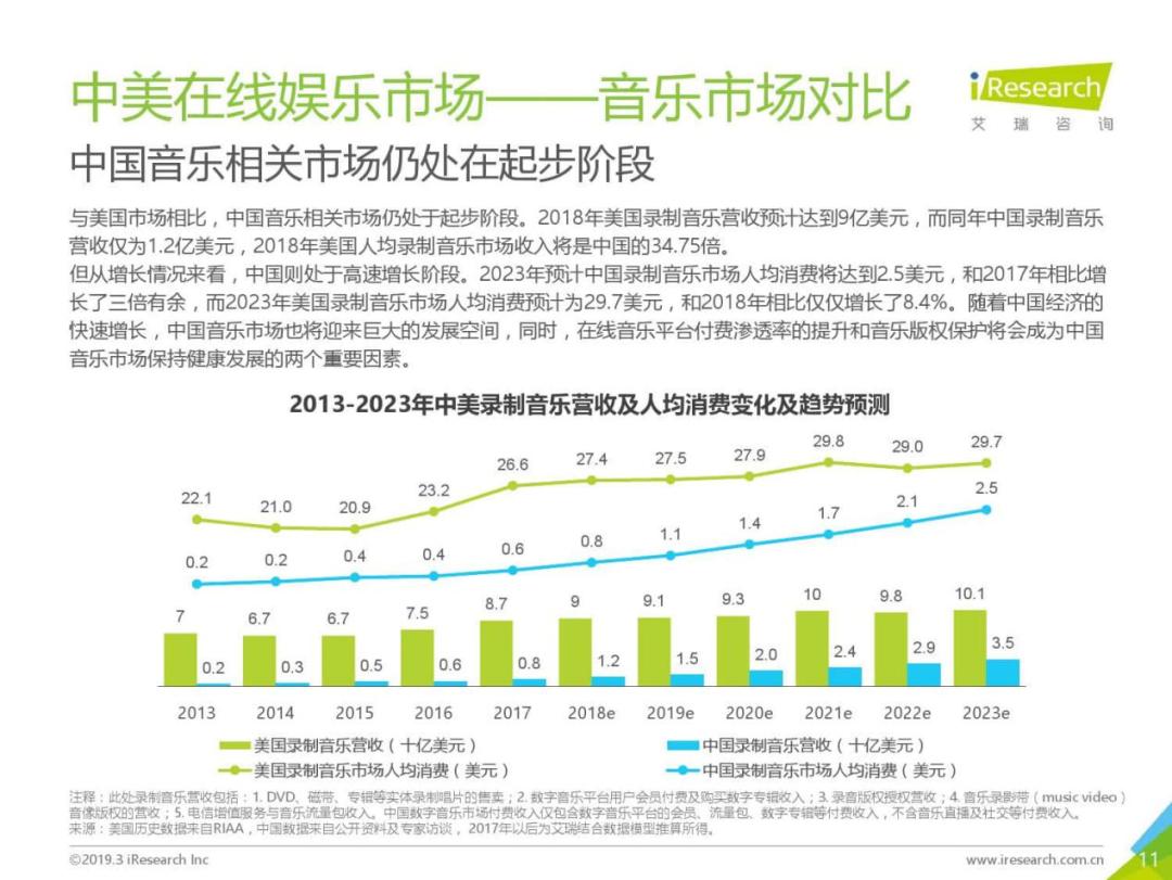 根据艾瑞咨询《2019年中国数字音乐产业研究报告》显示,2018年美国录制音乐营收9亿美元,而同年中国仅1.2亿美元,2018年美国人均录制音乐市场收入是中国的34.75倍。但与此同时,中国音乐市场目前正处于高速发展期,未来也将迎来巨大的市场红利。