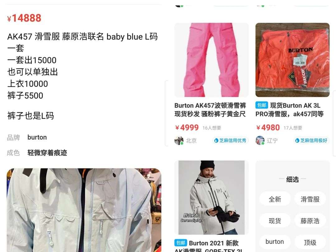 Burton有一款限量在日本发售的滑雪服AK457,价格大概在8000元左右,就是比利白的心头好。AK在单板雪服中有比较高的地位,很多圈里的大神都会买AK穿,去年一件原价3、4000元的粉色AK价格能被炒到过万。在闲鱼上,潮流大师藤原浩联名的一款蓝色AK滑雪服价格是15000元。