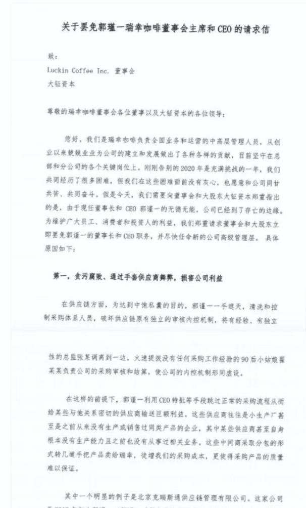1月6日晚间,脉脉等社交媒体开始发酵“瑞幸7位副总裁、所有分公司经理和核心业务总监签署联名信,集体要求罢免董事长兼CEO郭谨一。”的传闻。一份名为“关于罢免郭谨一瑞幸咖啡董事会主席和CEO的请求信”也流传开来。