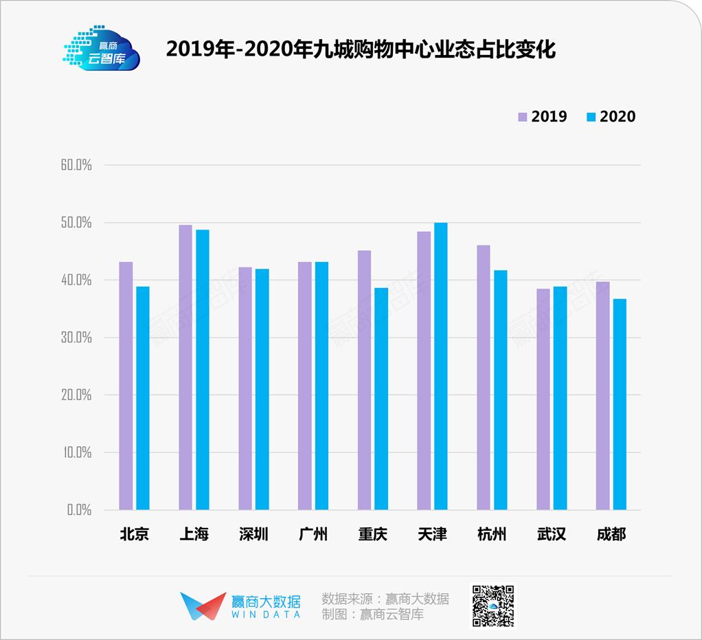 截至2020年三季度,9城中北京、重庆、杭州、成都体验业态占比较上年出现明显下降,但天津和武汉略有上升,上海、深圳、广州基本保持稳定。
