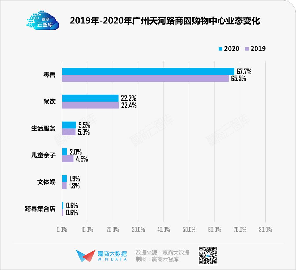 以广州天河路商圈为例,2020年零售业态占比上涨超过2.2个百分点,而儿童亲子业态则下降2.5个百分点,主要原因系购物中心儿童亲子业态品牌调整,大量品牌关店造成。