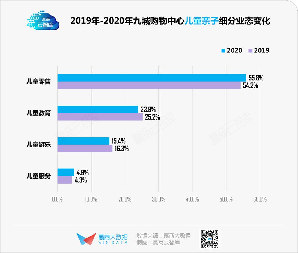 儿童亲子业态,儿童零售和儿童服务业态占比升高,而儿童教育和儿童游乐则出现下降。