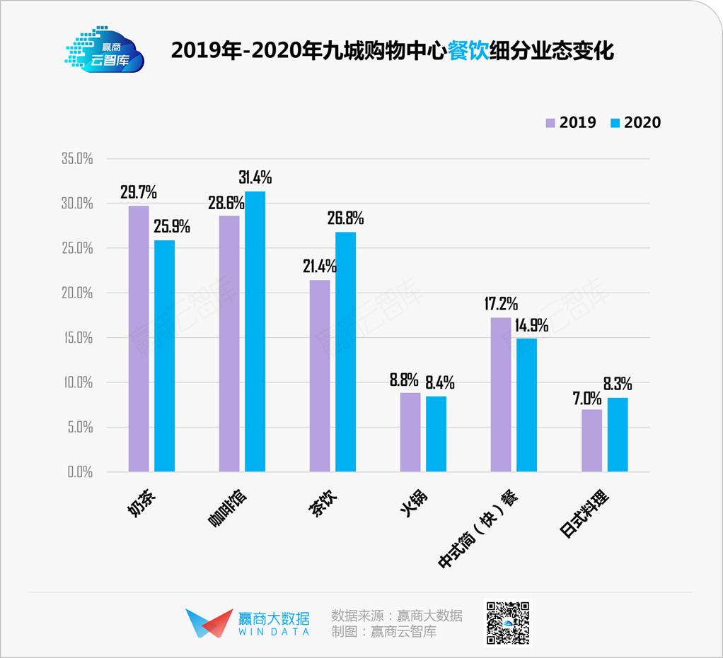 餐饮业态,奶茶、果汁、中式简(快)餐三种业态明显下滑,而咖啡馆、茶饮、日式料理占比则有所上升。