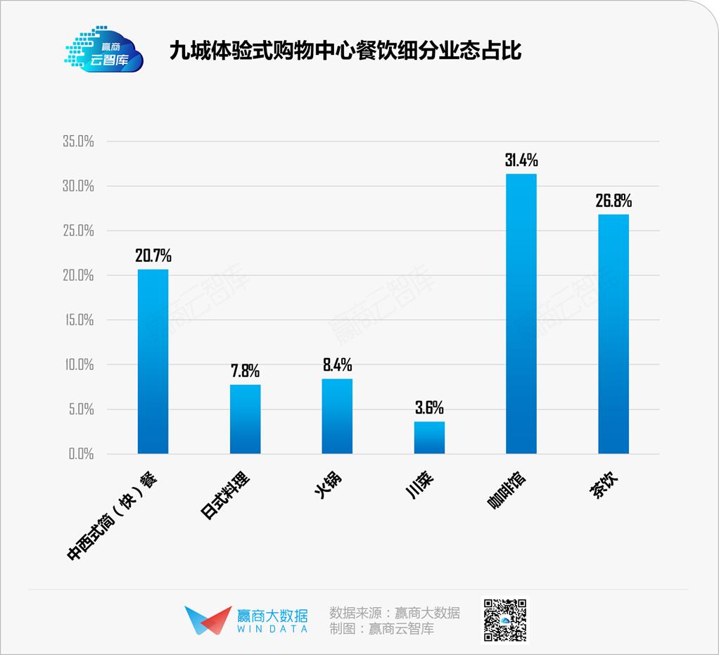 餐饮业态,体验式购物中心占比接近3成,是非体验式购物中心的近2倍。