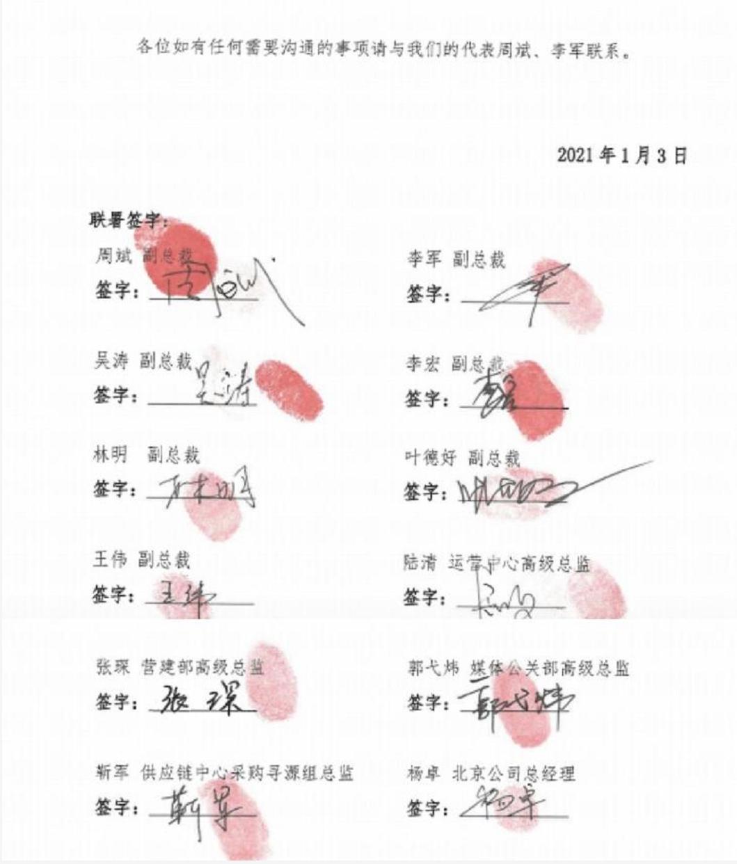 从联名信结尾的表述看,本次行动是由副总裁周斌和副总裁李军在主导。