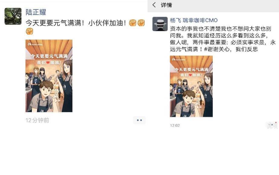 在爆发造假丑闻以后,瑞幸咖啡实际控制人陆正耀并没有束手就擒,而是和CMO杨飞在朋友圈发声明要“元气满满”。