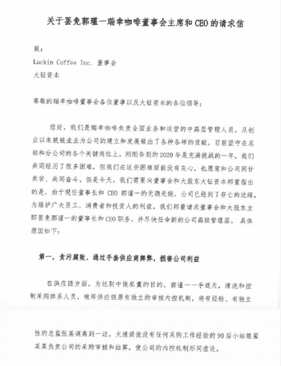 包括副总裁、分公司经理、事业部总监在内的40位瑞幸咖啡高管,签署了一封《关于罢免郭谨一瑞幸咖啡董事会主席和CEO的请求信》,要求瑞幸咖啡董事会和大股东之一大钲资本表态,对现有董事会主席和CEO实施罢免。