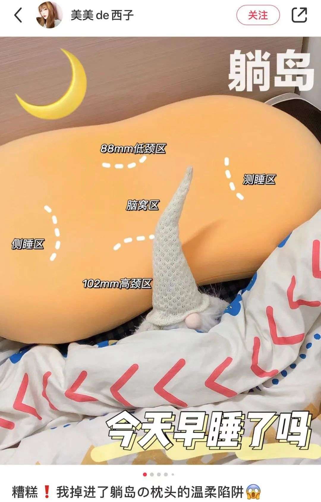 “躺岛”是最近在小红书、微博和B站等社交平台上到处可见的一款网红枕头,小红书笔记超过1万。其猫肚皮的造型十分讨喜,也主打“如同睡在猫肚皮上”的体感,以及符合人体工学的躺、靠多功能性,但398元的价格比网易严选的普通乳胶枕、记忆枕贵上近一倍。