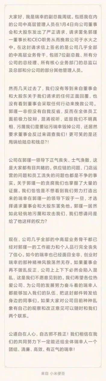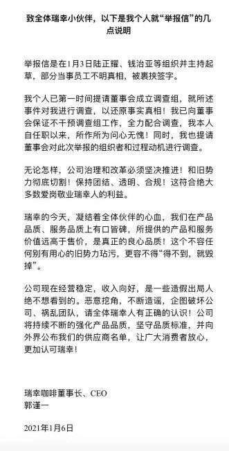 2021年1月6日晚间,对于郭谨一全员内部信,瑞幸副总裁周斌、李军发文反击称,几乎所有的中高层业务骨干都在请求罢免郭谨一的请求信上签字。但是董事会和大股东没有给任何正面回复,也未采取任何行动。