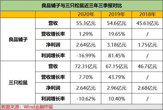 而同为竞争对手的三只松鼠尽管面临着同样“增收不增利”的窘境,但却明显要比良品铺子更有优势。根据其发布的2020年第三季度财报显示,前三季度营业收入72.31亿元,同比增长7.7%;实现净利润2.64亿元,同比下滑10.62%。