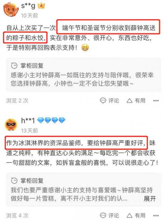 从钟薛高天猫旗舰店的评价来看,不论是“新客”还是“回头客”,对其评价都偏正向。口感也是对得起它的高价位的。