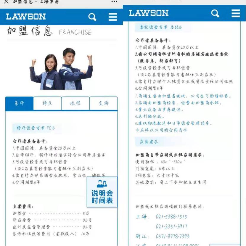 上海罗森的官微显示,目前有两种加盟方案:一种叫特许经营方案,一种叫委托经营方案,前期投入都在20万以上。前者要求自带店铺和正副店长,那就意味着前期投入成本可能回到30万以上。