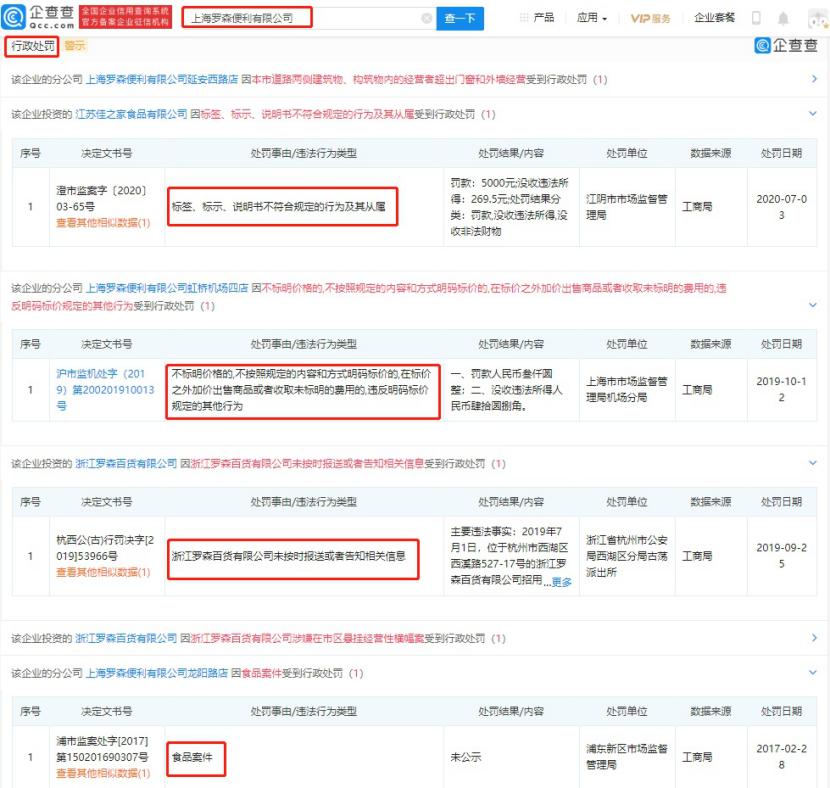上海罗森便利有限公司龙阳路店就曾因“食品案件”被罚,而上海罗森便利有限公司虹桥机场四店也曾因“不标明价格、不按照规定的内容和方式明码标价、在标价之外加价出售商品或者收取未标明的费用”等行为被行政处罚: