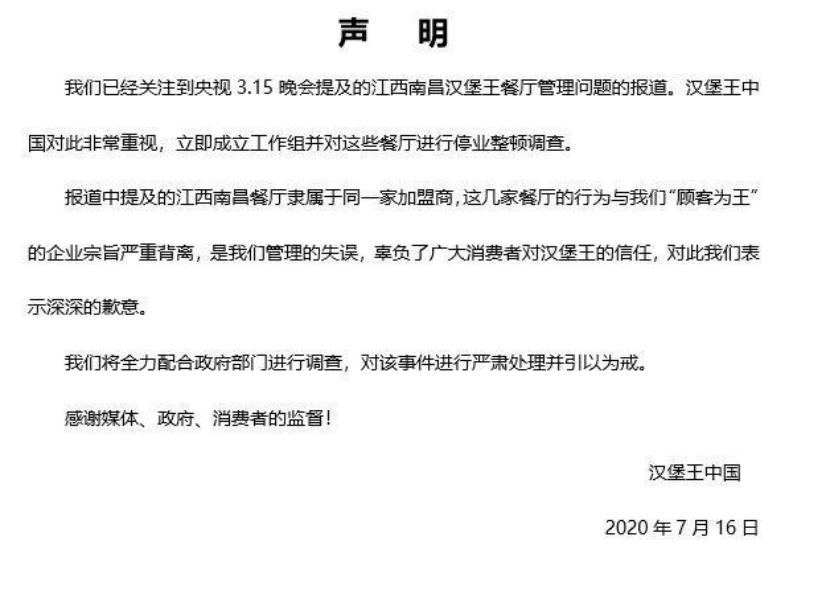 像汉堡王在今年7月16日,被315晚会曝光偷工减料,销售过期食材。汉堡王指出涉事门店是加盟商,和企业顾客为王的宗旨严重背离,已经责令餐厅停业整顿调查。