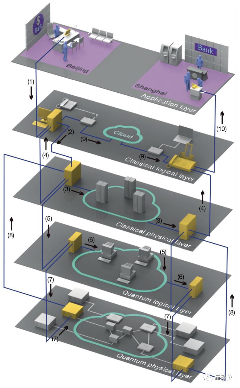 整个网络由五层组成:应用层、经典逻辑层、经典物理层、量子逻辑层和量子物理层。