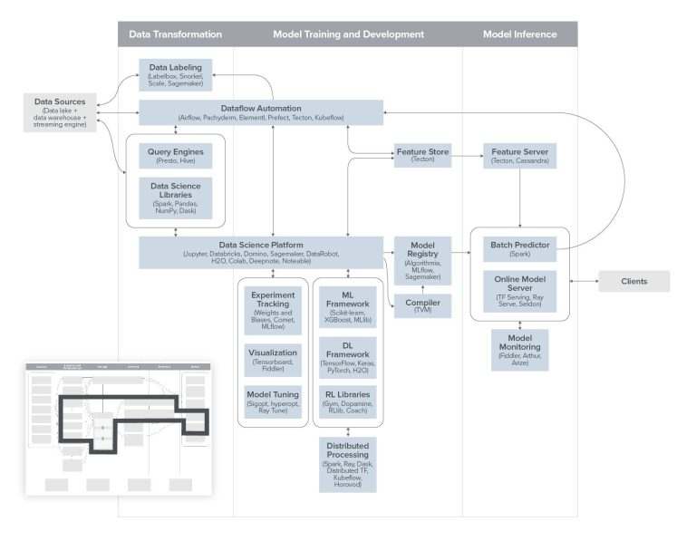 大想法:鉴于可在生产中可靠运行运营性AI / ML的工具出现了爆炸式增长,高端数据科学正在为更多的玩家所用。企业运营所依赖的模型有的就是由这些系统运行的(比如,Lyft或Uber的打车定价机制)。开源库以及方法论也让这些工具包变得更加成熟,并降低了准入门槛。下图就是我们提供的一个用于AI / ML技术栈的模型架构——其中包括了从数据转换到模型训练、开发以及推理等内容。