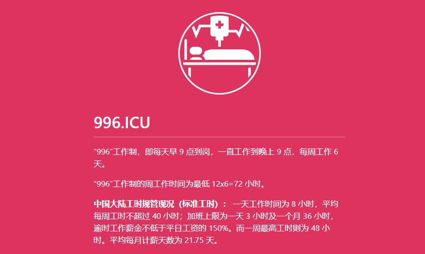 这一项目取“工作996,生病ICU”之意,旨在表达对互联网企业实施以996(早九点上班,晚九点下班,一周工作六天)为代表的超长时间工作制的抗议。