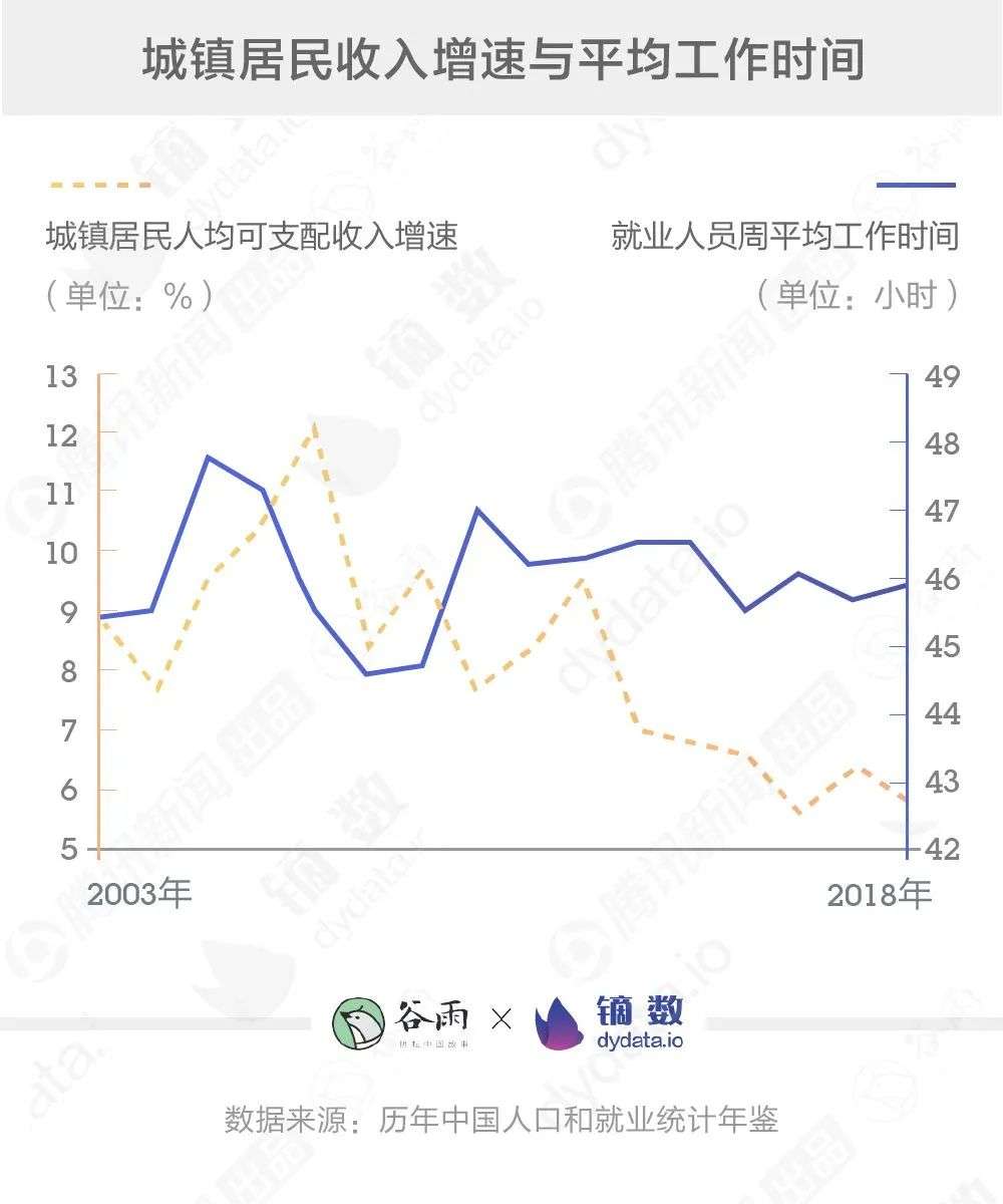 谷雨实验室联合镝数发布的另一项调研报告指出,对比我国2003年至2018年的居民收入和工作时长数据,这15年间居民工作时间基本稳定,而收入增速却逐步下降。说明国人虽然持续性加班,却没有获得同等增幅的收入回报。