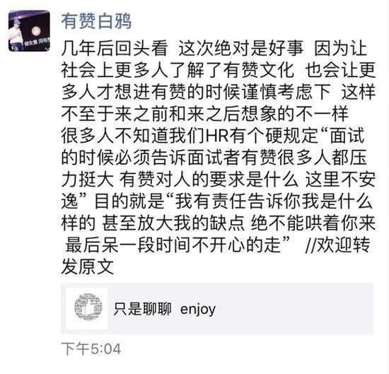 到了2019年1月,有赞在年会上公开宣布实行996,有赞CEO白鸦还表示“过几年之后再看,这次绝对是好事”,在舆论哗然之下,这场闹剧最终以劳动监察部门介入调查告一段落。