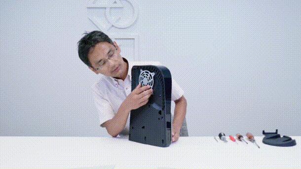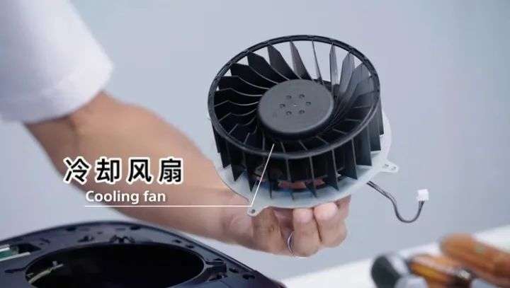 他轻轻一扳,卸下白色外壳,就能看到主机风扇,它可以从两侧吸入空气,冷却主板,确保PS5长时间工作也不会过热。