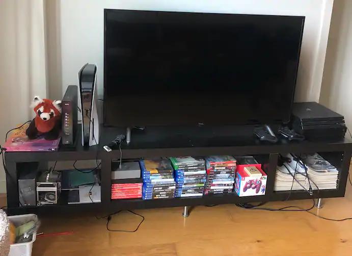 记者基尼·帕克的公寓只有46平米,他想把PS5立在电视柜旁,却担心猫会弄倒主机,只能把电视机前移,让PS5平放在电视机后面。