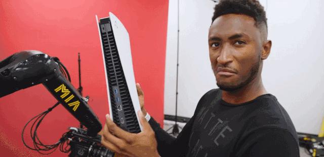 油管博主马克斯皱着眉头打量, 掂量是他的胸肌大还是PS5更大