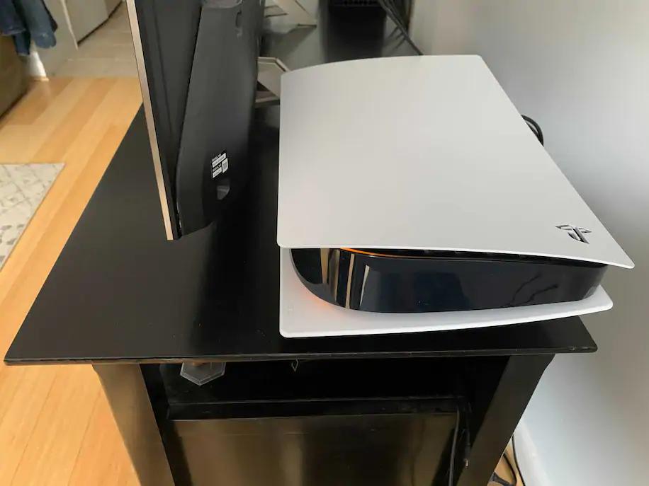 通常,玩家都选择把PS5挂在电视机旁,以黄金比例安装,还留有区域放置游戏手柄。