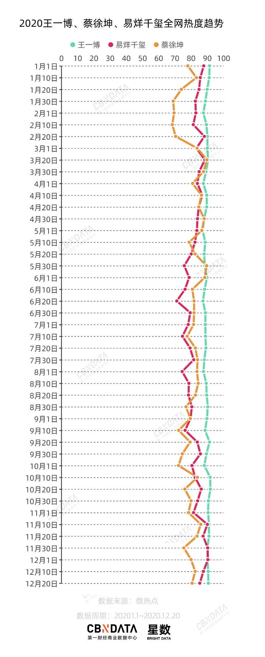224个热搜,王一博2020年的微博成绩单相当于1.5个易烊千玺、2个郑爽、3.2个虞书欣。微热点研究院数据显示,王一博全年的全网热度基本在90分(满分为100)上下徘徊,与同样流量可观的易烊千玺和蔡徐坤相比,热度更为平稳。