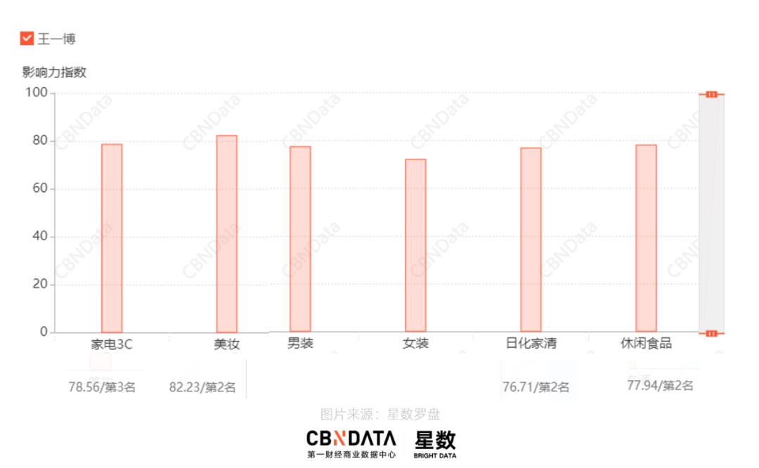 根据CBNData星数罗盘的最新数据,王一博在家电3C、美妆、日化家清、休闲食品四大品类都展现强势的带货力,稳居前三名,这四个品类的最带货商品分别为红米手机、完子心选面膜、安慕希酸奶、舒肤佳沐浴露,这也意味着他已经在现有的绝大多数领域建立起了牢固的带货护城河。