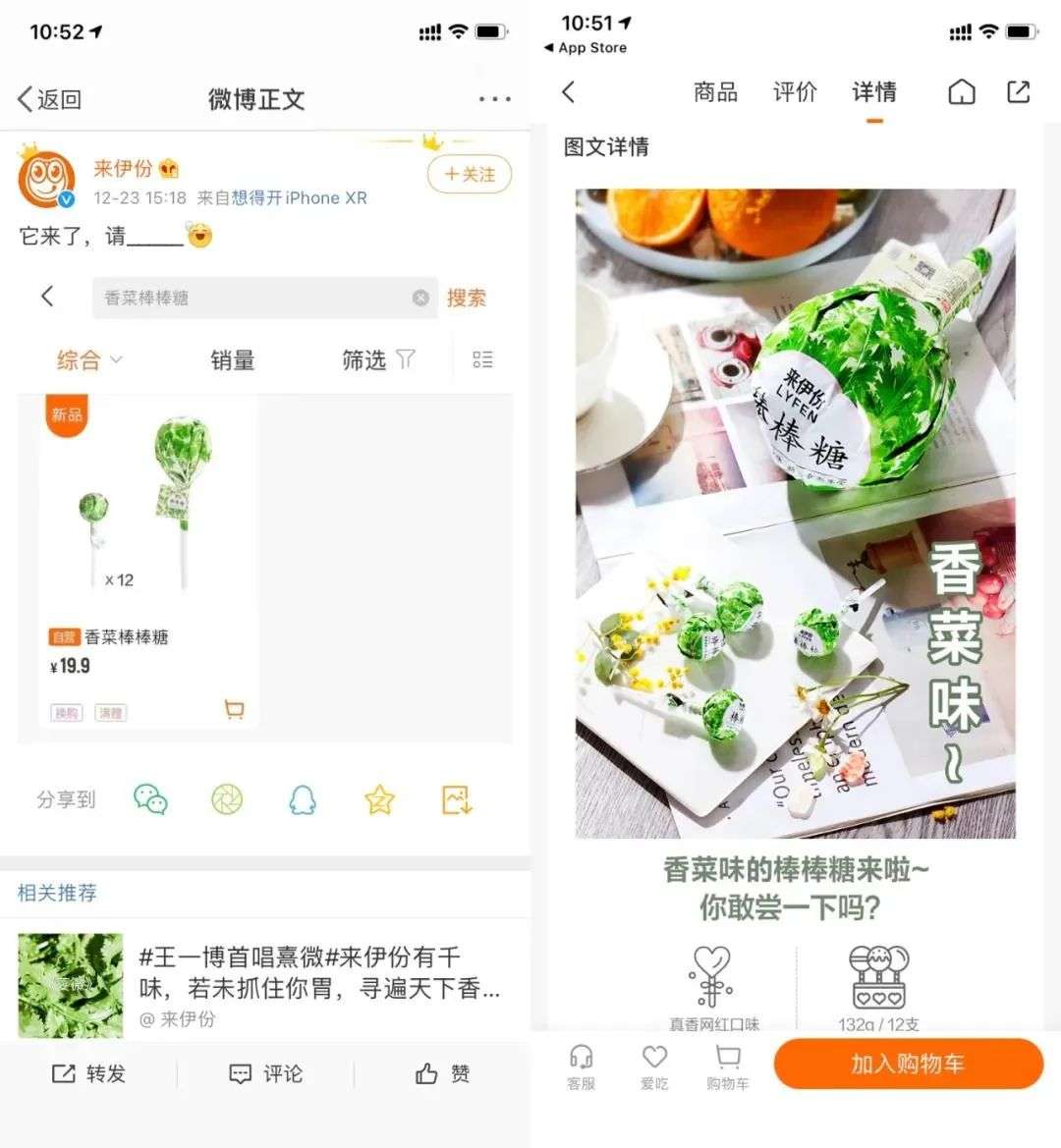 仅仅是因为“王一博爱吃香菜”这个在粉丝群体中广泛流传的“梗”,便有不少品牌用来做起了生意。2020年年末,来伊份相继推出香菜味饼干和棒棒糖。更早一点,上好佳推出了香菜味田园薯片、安慕希限量销售过王一博庆生款“香菜味酸奶”,均收获了不错反响。