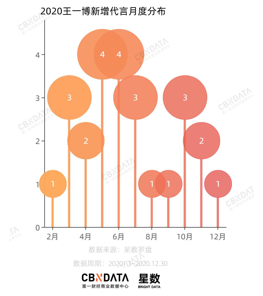 首先从时间维度来看,王一博的品牌合作在5、6、7月有了一波爆发,新代言总数达11个,意味着在这三个月内他以每周一个的频率接到品牌合作;此后,在10、11月有了第二个小峰值。通过消费市场不难判断,不少品牌都选择在618和双11两大重要消费节点进行曝光,叠加代言人策略和消费氛围试图获取1+1大于2 的营销效果。