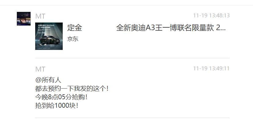 一个更为出圈的类似事件是,去年11月中旬,奥迪A3推出了王一博联名限量版汽车,仅通过线上渠道发售23台,且均以秒杀的形式放出购买名额。联名款上线当晚,有黄牛表示将以1000块回收购买资格,侧面验证了这一营销的市场热度。