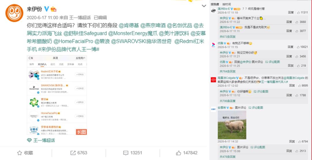 除了主动联合,也有些另辟蹊径的品牌运用单方面“营业”,获得了不错的营销效果。作为微博提及王一博次数最多、声量最高的品牌,来伊份非常擅长“社交”。
