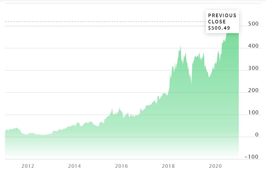 Netflix近十年间股价变化。截止2021年1月6日,报收500.49美元/股,市值超过2000亿美金(来源:nasdaq)