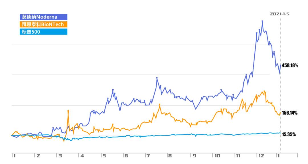 截至美国时间1月5日收盘,Moderna股价自2020年初新冠疫情以来涨幅达到458.18%,BioNTech涨幅为156.14%,均远超过标普500指数15.35%的涨幅。