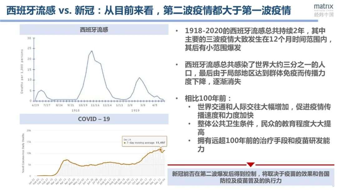 与100年前相比,世界的交通和人际交往大幅增加,加快了本次新冠疫情传播速度和力度。但与此同时,整体的公共卫生条件以及民众的教育程度大大提高,也拥有远超100年前的治疗手段和疫苗研发能力。
