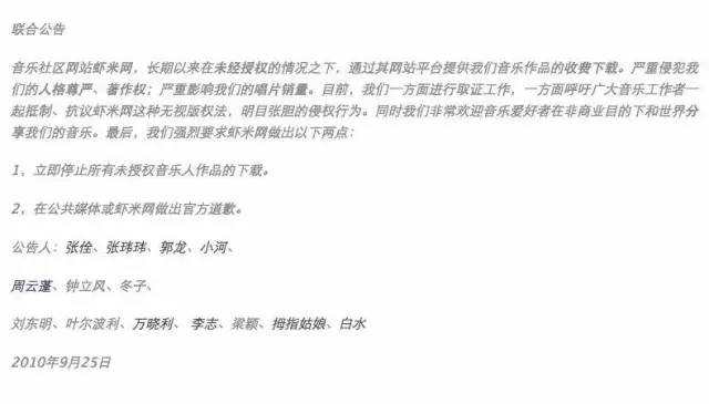 2010年9月,著名的南京李先生联合十几名民谣艺人发出联合声明,抗议虾米收费下载侵犯其版权,要求虾米网道歉。虾米悄悄删除了相关音乐专辑,但不是全部,落下了“没有诚意”的指责。