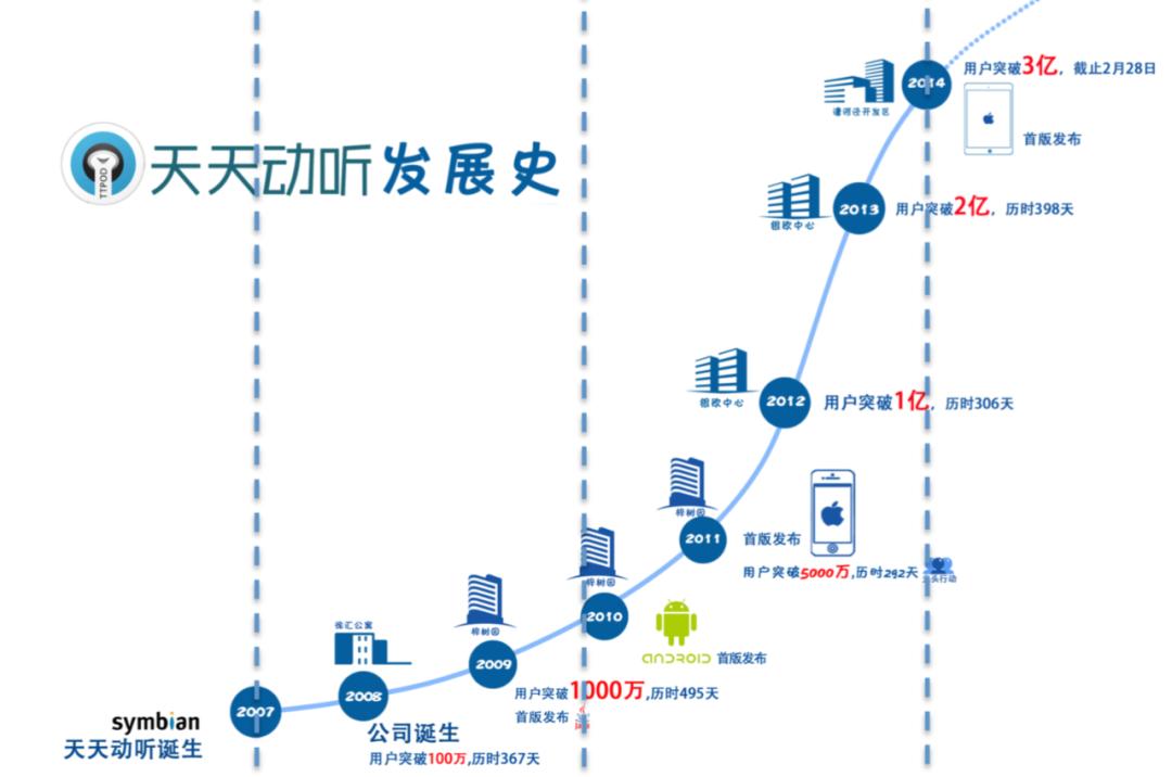 作为一个后起之秀,天天动听凭借出色的交互体验,一度曾经是行业里的明星产品,发展速度之快,令友商们虎躯一震。天天动听用户量突破1亿大关,只用了306天,突破2亿,只用了398天。