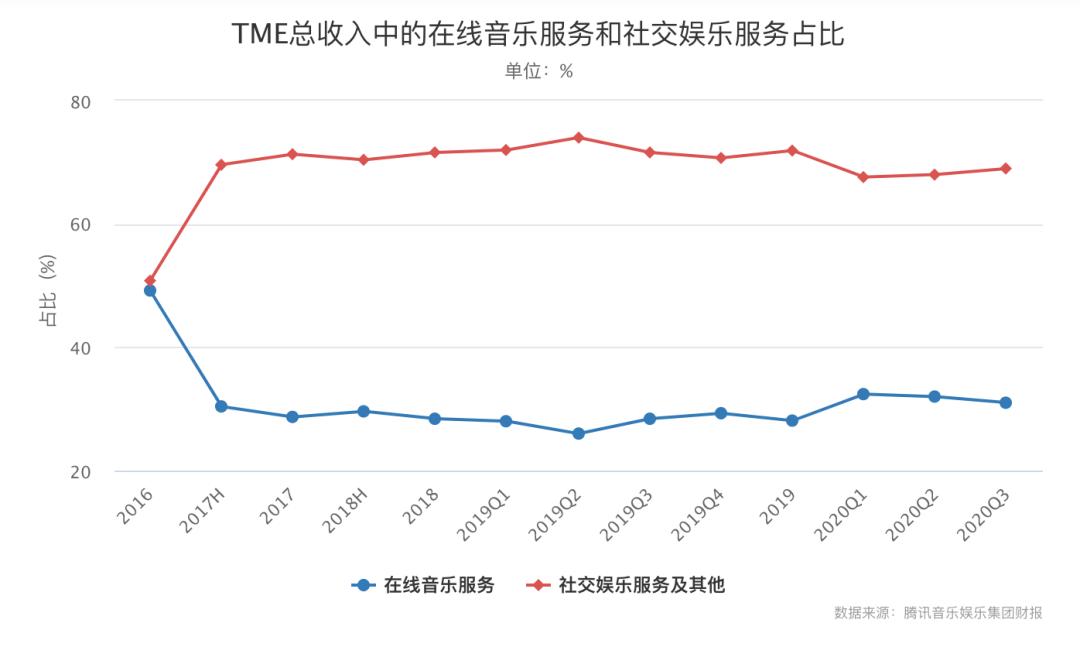 但作为国内目前唯一公开盈利的互联网音乐公司,TME将近70%的营收来源依然是社交娱乐。QQ音乐尝试在歌曲播放间插播广告,依然被用户吐槽。