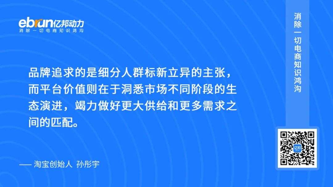 犹记得淘宝创始人孙彤宇说过的那句话:“品牌追求的是细分人群标新立异的主张,而平台价值则在于洞悉市场不同阶段的生态演进,竭力做好更大供给和更多需求之间的匹配。”