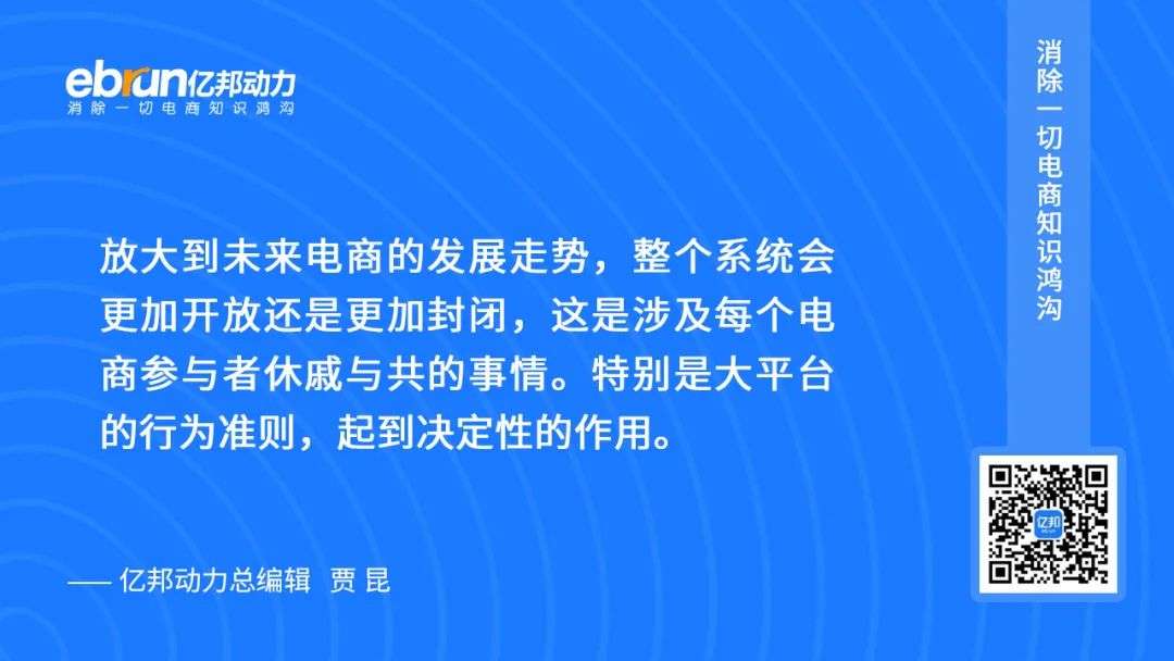 放大到未来电商的发展走势,整个系统会更加开放还是更加封闭,这是涉及每个电商参与者休戚与共的事情。特别是大平台的行为准则,起到决定性的作用。