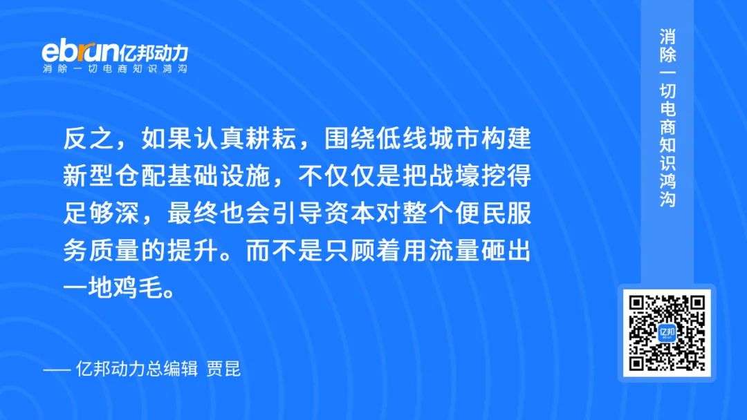 反之,如果认真耕耘,围绕低线城市构建新型仓配基础设施,不仅仅是把战壕挖得足够深,最终也会引导资本对整个便民服务质量的提升。而不是只顾着用流量砸出一地鸡毛。