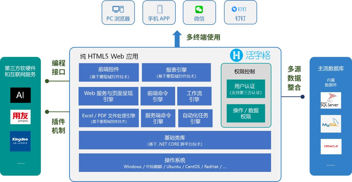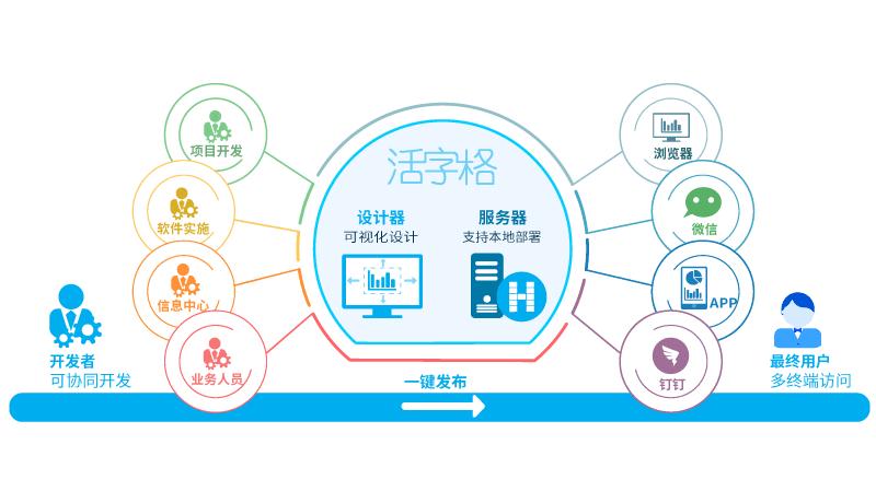 活字格平台同步支持本地部署与云部署,可以与微信、钉钉等企业日常应用软件无缝集成,并实现和用友、SAP、金蝶等行业软件的深度集成。如此,软件开发公司、系统集成商、独立开发者便成为软件开发服务生态中的一部分,通过活字格平台“互通有无”,最终共同服务于终端的企业软件开发。