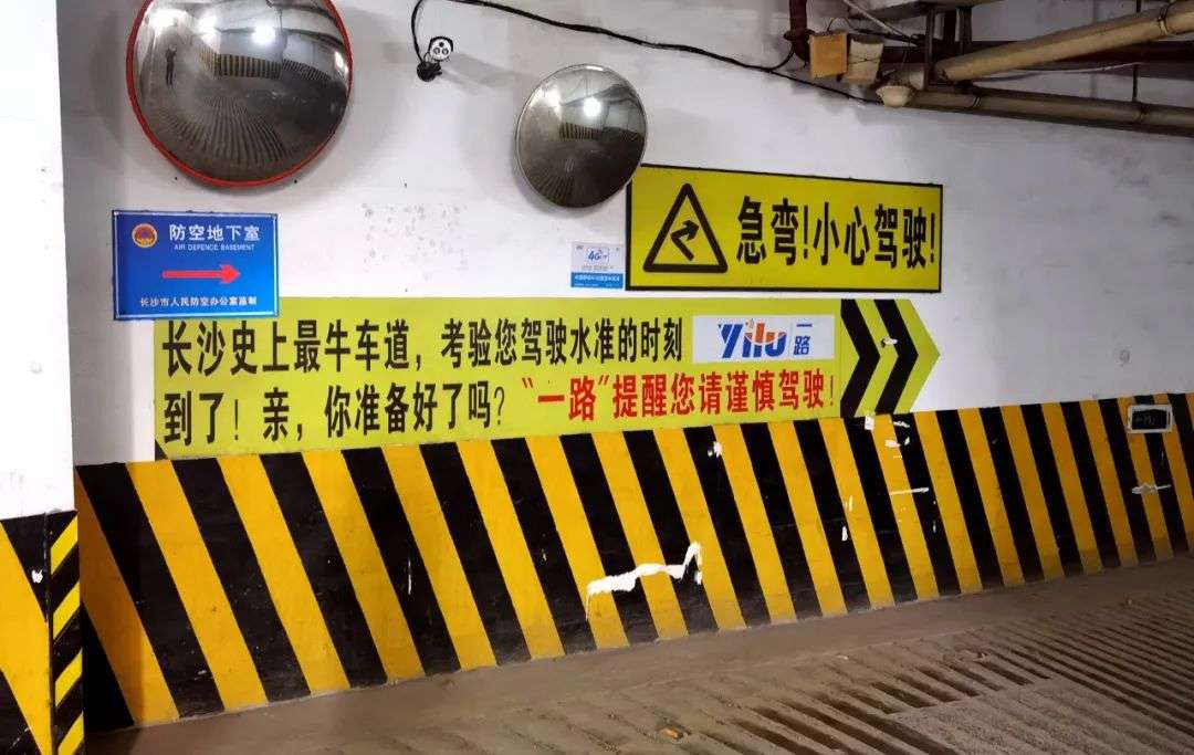 一下去,你会遇到一个接近180度的右后方急转弯,墙上则写着这样一条提示:“长沙史上最牛车道,考验您驾驶水准的时刻到了!”