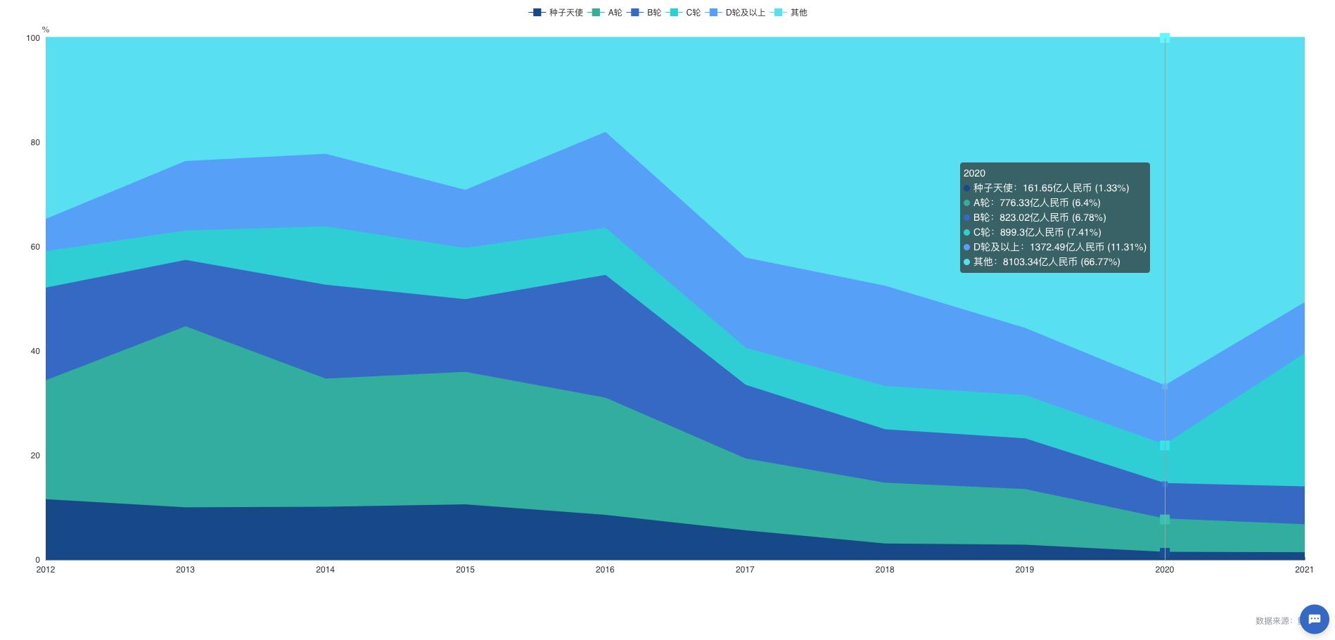 2020年种子天使轮融资约162亿元,A轮融资776亿元,B轮融资823亿元,C轮融资899亿元,D轮及以后融资1372亿元。