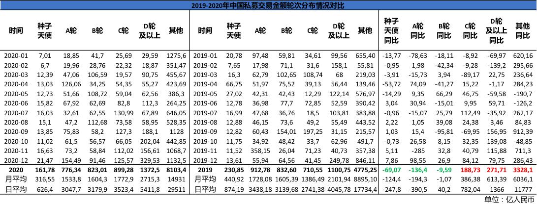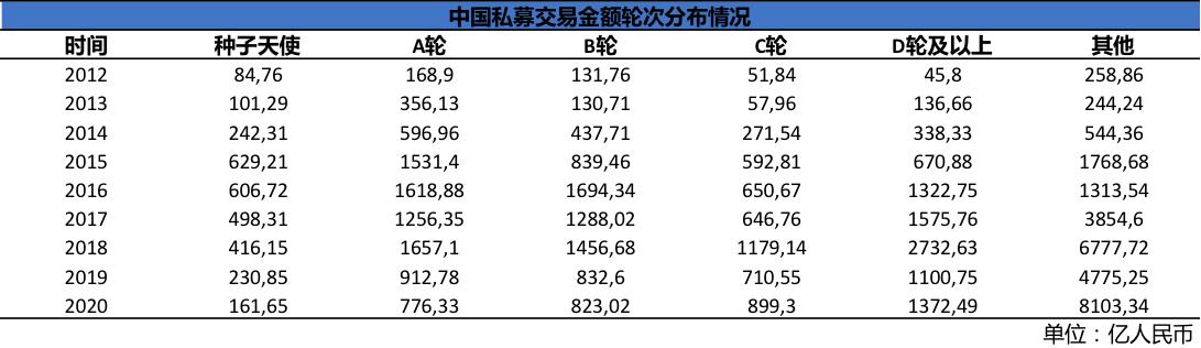 (2012-2020年中国私募交易金额轮次分布情况 图片来源:鲸准)