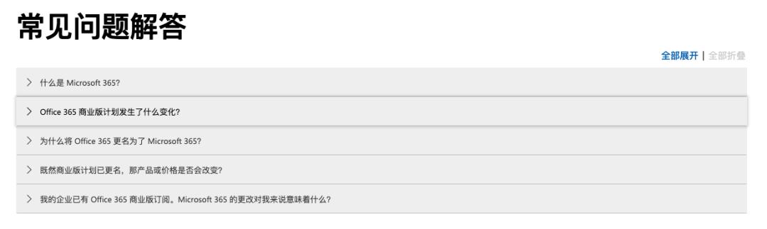 微软官方网站上就有不少应用 Fluent Design 的典范,例如上文所提到的光影交互,在微软官网 office 365 介绍页末尾的问答区移动鼠标,相应内容边缘处会自动呈现出阴影加深的交互动画,更容易辨认。
