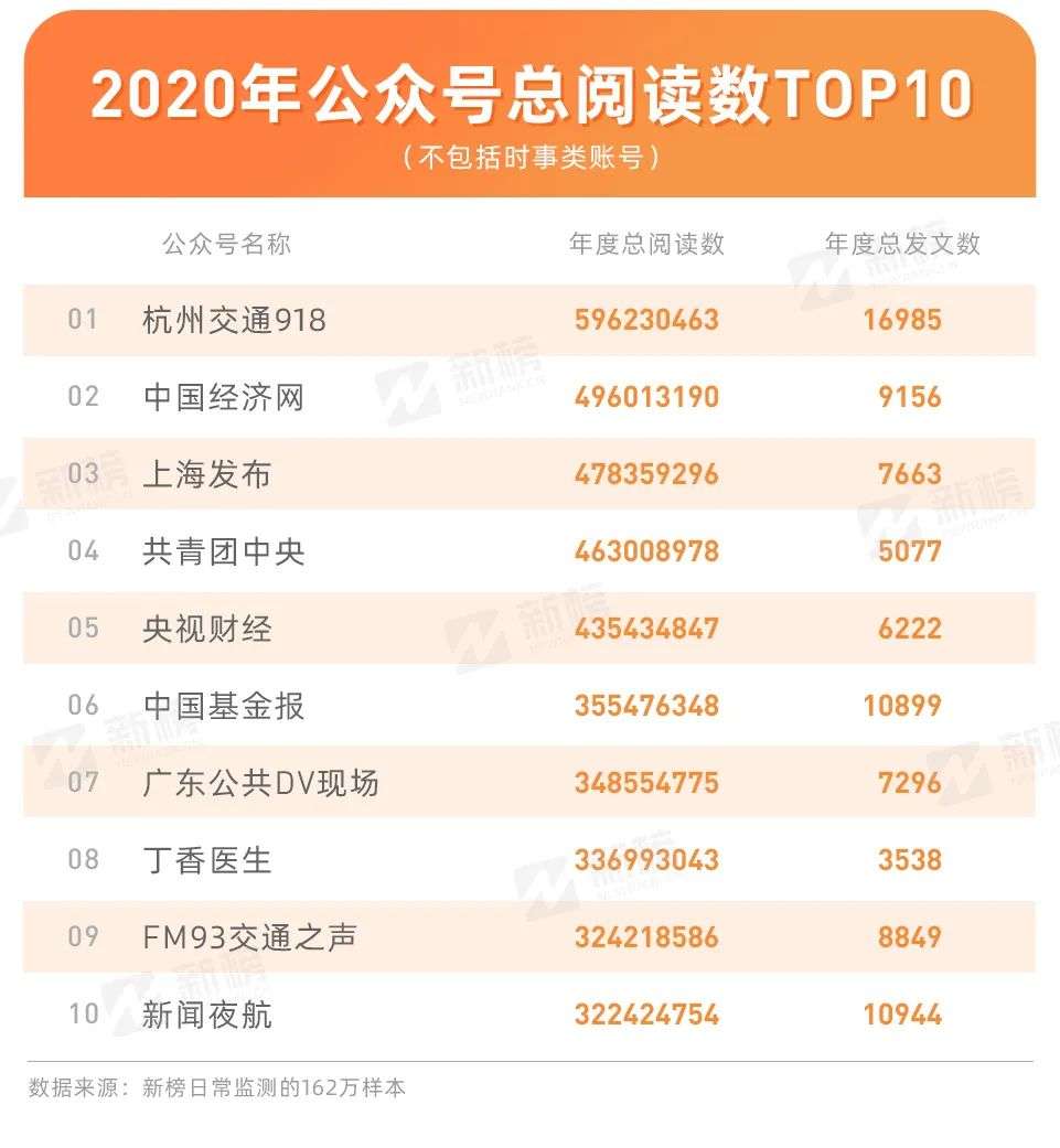 按照单篇阅读数最高10万来计算,在剔除了“人民日报”、“央视新闻”等时事类账号后,2020年文章总阅读数最高的是“杭州交通918”,发文16985篇,总阅读数5.96亿次。