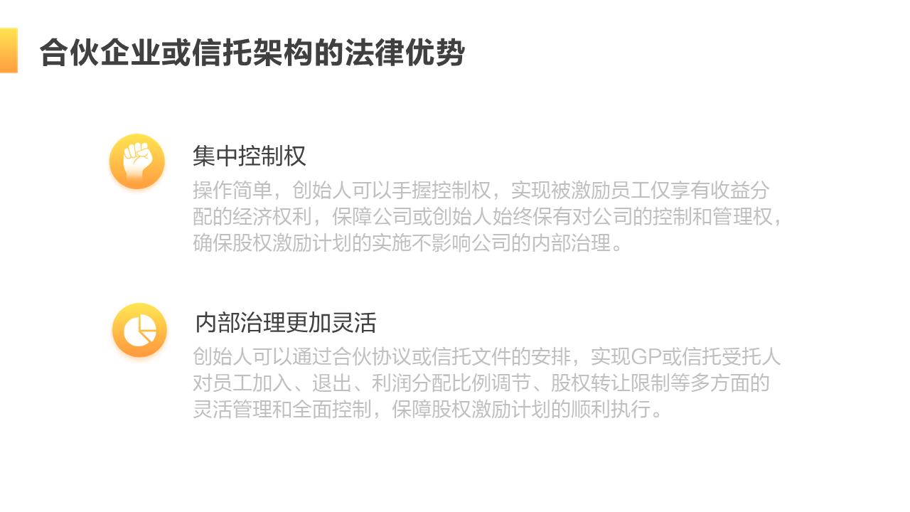 从法律角度来说,合伙或信托架构的优势主要体现在:能够通过合伙协议或信托文件的安排,实现被激励员工仅享有经济权利,表决权保留在GP或者信托受托人手中,再通过相应的机制设计和安排,确保激励计划的实施不影响公司的内部治理。