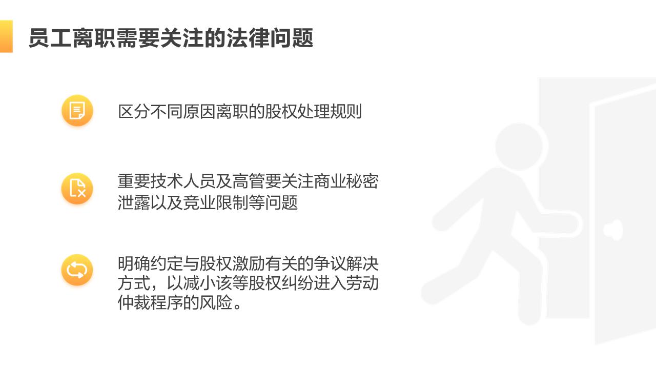 尤其需要注意的是,对于重要技术及管理人员的离职,需要特别关注是否引发公司商业秘密泄露、竞业限制等问题。通常,公司在与这些重要人士签署劳动合同时,都会额外签署保密协议、竞业限制协议等,其实也可以在股权激励协议中对这些问题再进行约定,以减少在执行过程中的争议。